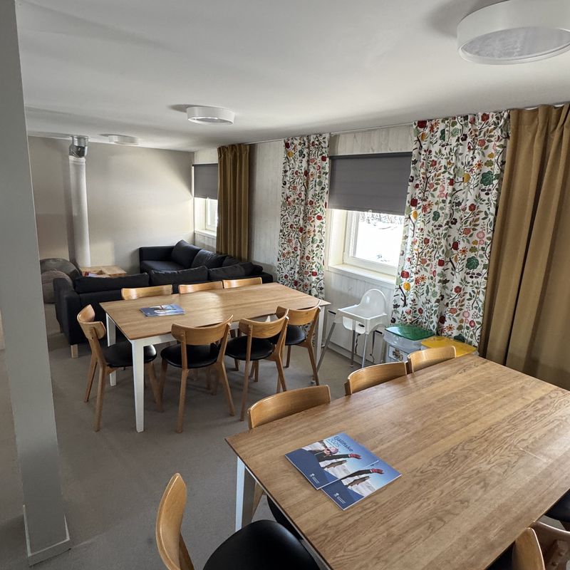 Fyrbäddsrum med två våningssängar varav en med båda bäddarna 90 cm och den andra med nedre bädden 120 cm och övre bädden 90 cm. I rummet finns hyllor för klädförvaring. Sängarna är bäddade och det finns badlakan. Dusch och toalett finns i gemensamhetsutrymmen.