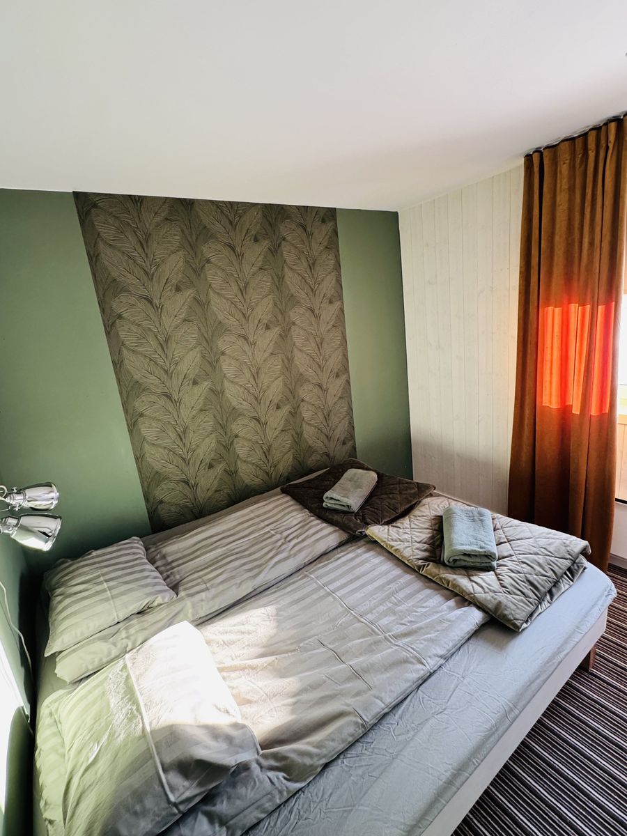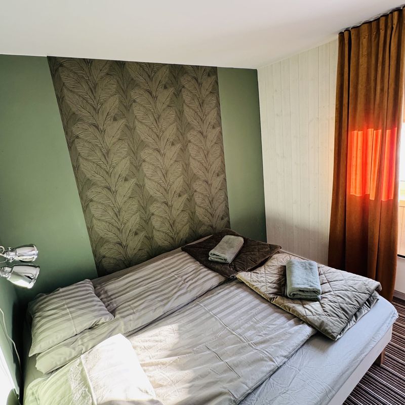 Rum med dubbelsäng och en liten sällskapsyta med soffa som kan användas som bädd för ett barn. I rummet finns soffa och hyllor för klädförvaring. Sängarna är bäddade och det finns badlakan. Dusch och toalett finns i gemensamhetsutrymmen.