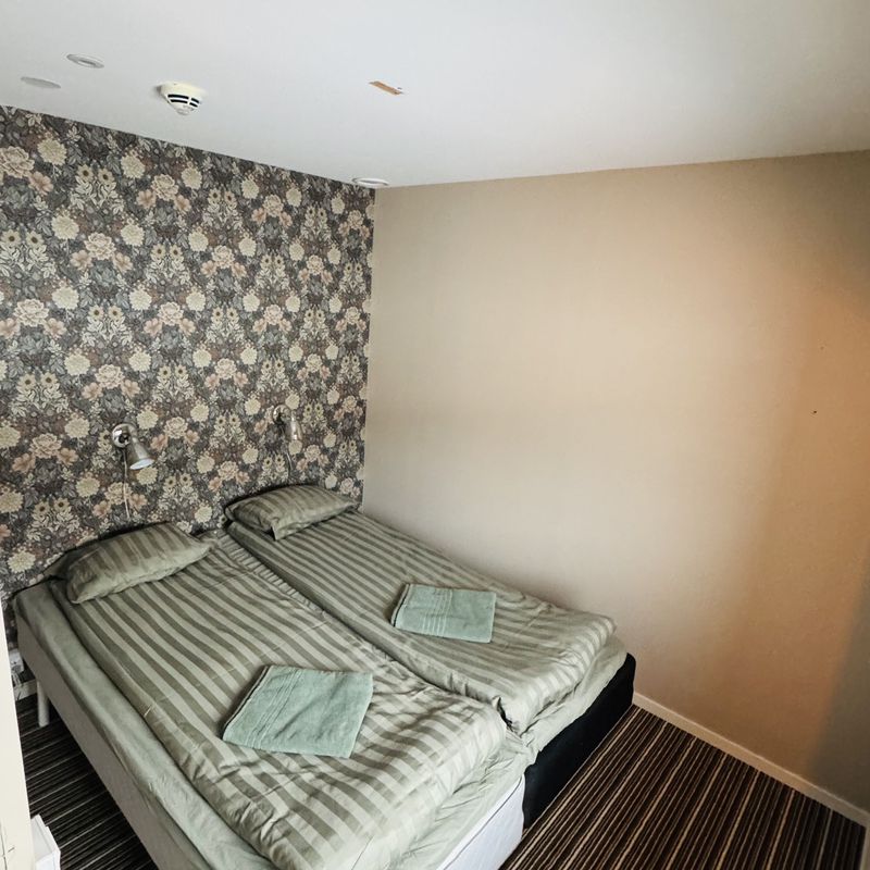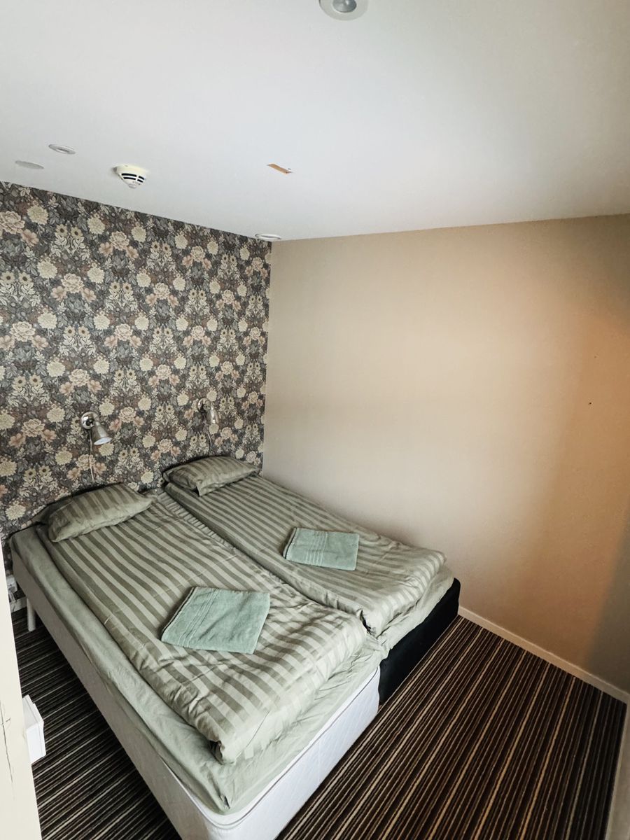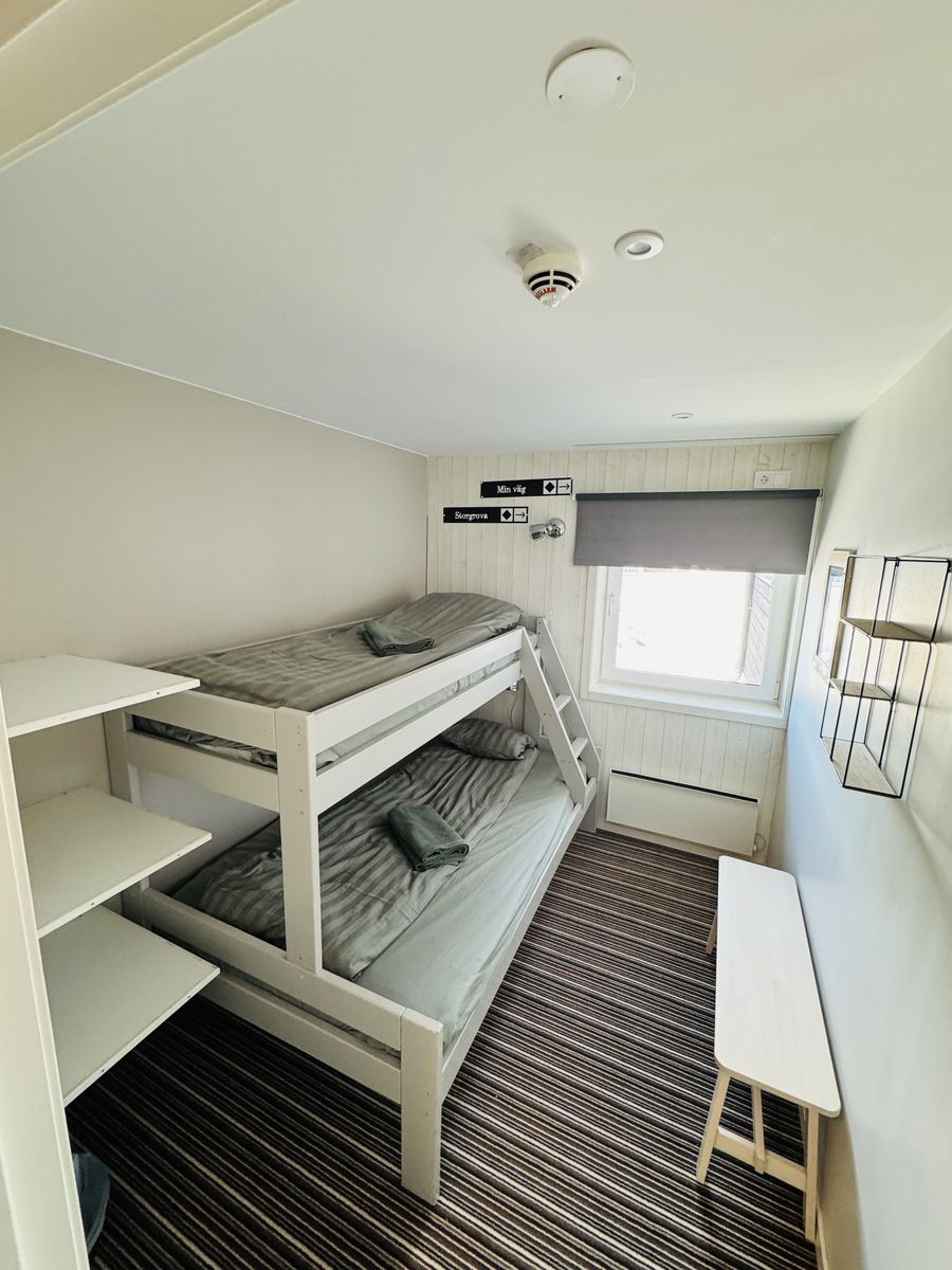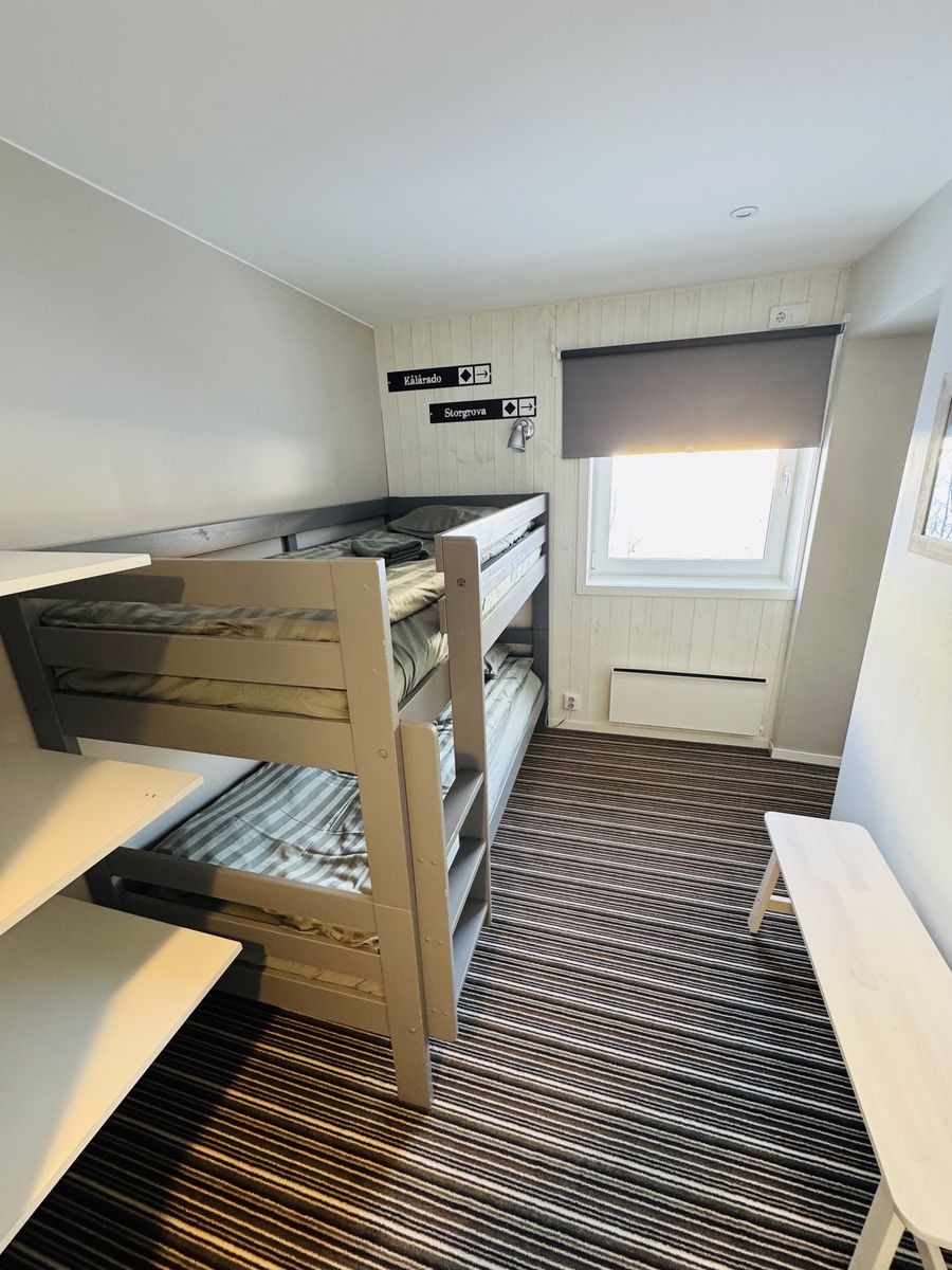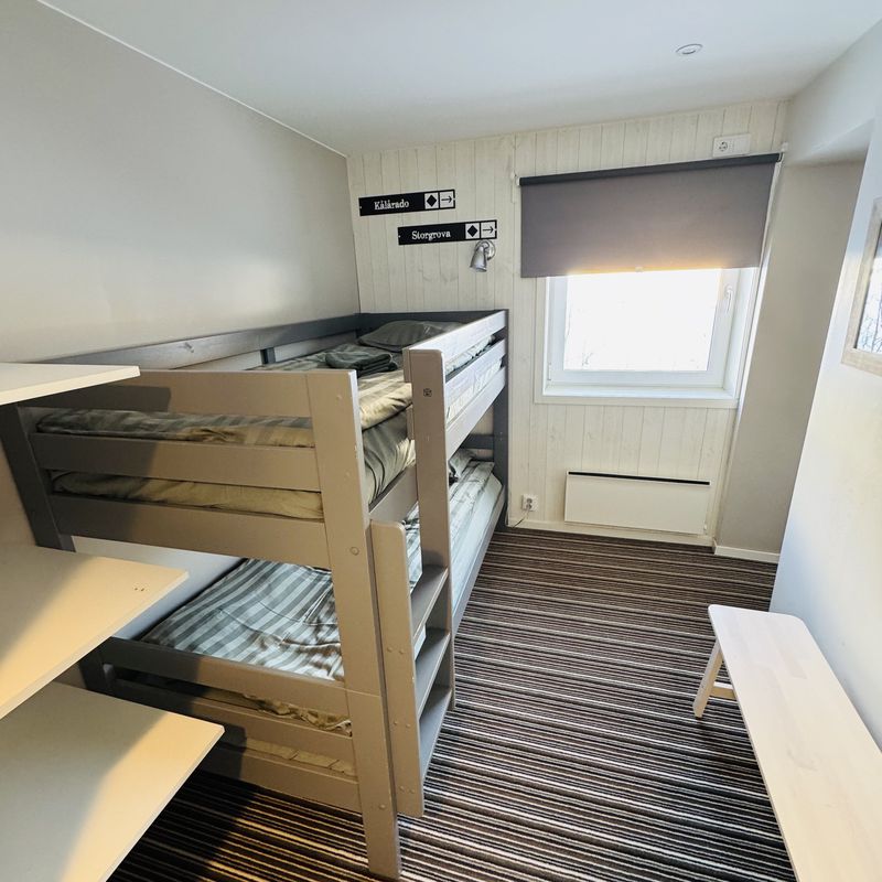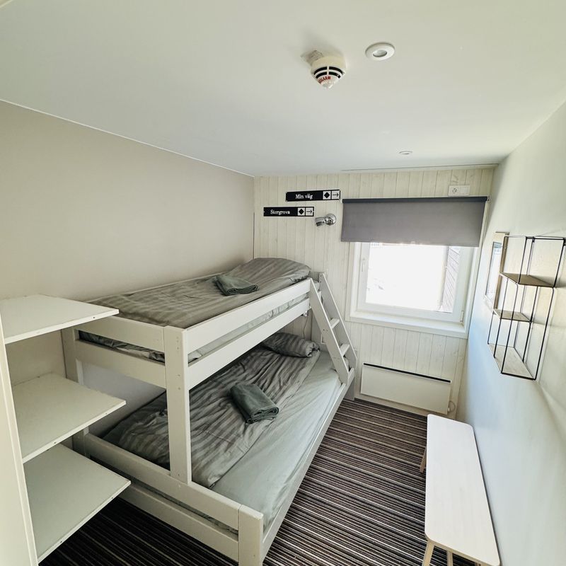 Tvåbäddsrum med våningssäng där den nedre bädden är 120 cm och den övre 90 cm. I rummet finns hyllor för klädförvaring. Sängarna är bäddade och det finns badlakan. Dusch och toalett finns i gemensamhetsutrymmen.