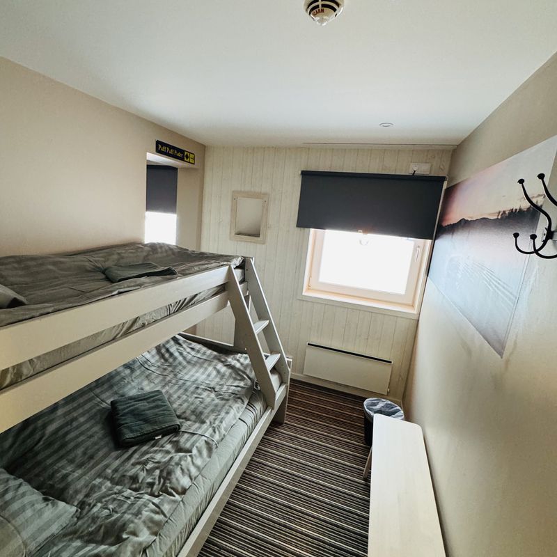 Familjerum med en dubbelsäng och en våningssäng där nedre bädden är 120 cm och övre bädden 90 cm. I rummet finns hyllor för klädförvaring. Sängarna är bäddade och det finns badlakan. Dusch och toalett finns i gemensamhetsutrymmen.